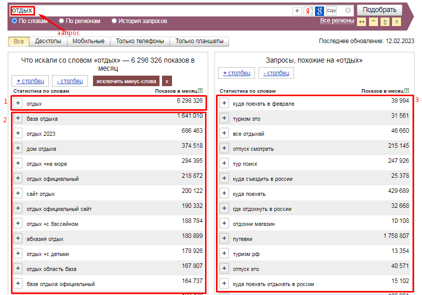 Цифры показывают, сколько раз в месяц интересуются каждой фразой, т. е. указывают на ее частотность.
