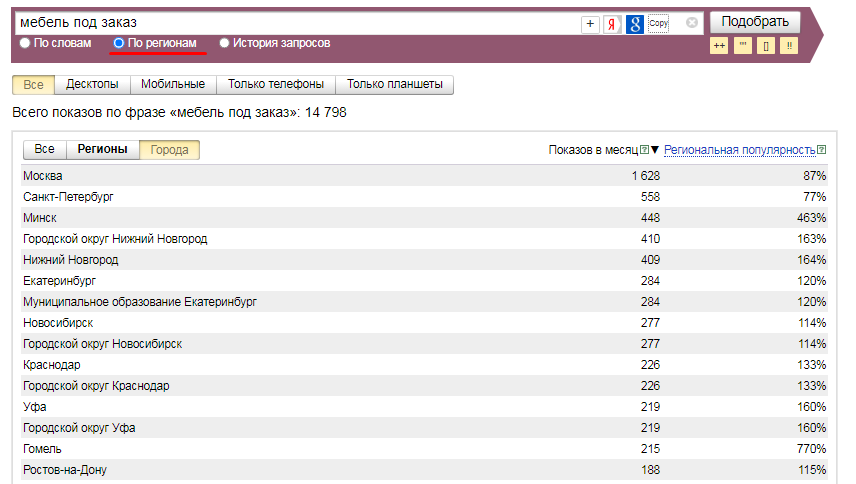 По умолчанию статистика запросов в Вордстате собирается со всего поиска. Если вы хотите узнать, как ищут запрос в конкретном регионе, необходимо задать соответствующие настройки в отдельной вкладке.