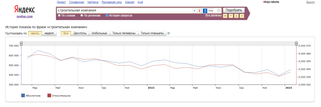 Переоценить важность таких данных для бизнеса сложно. По сути, «Я.Вордстат» собрал и упорядочил информацию об интересах вашей целевой аудитории, причем предоставил ее совершенно бесплатно. С помощью инструмента можно быстро узнать, насколько востребован конкретный продукт, в каком регионе и когда им больше интересуются. В итоге бизнес получает возможность формирования стратегии развития не на основе голых предположений, а опираясь на достоверные статистические данные. Чтобы понимать, как это работает на практике, рассмотрим пример из очень конкурентной ниши строительного инструмента.