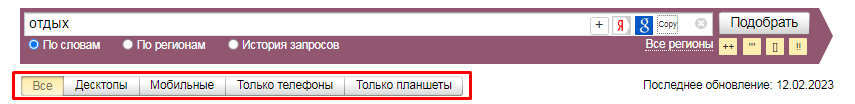 По умолчанию Вордстат отображает долю запросов со всех устройств. При необходимости статистику можно сегментировать: посмотреть, как интересуется фразой отдельно мобильная и отдельно десктопная аудитория. Также доступна фильтрация по устройствам: смартфонам и планшетам.