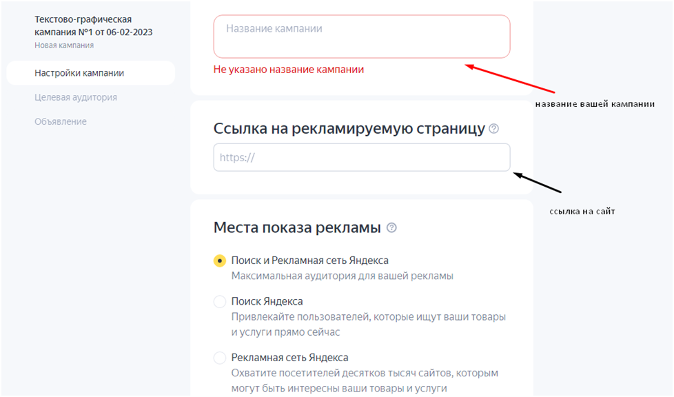 • Указать счетчик метрики. Если счетчика метрики нет, то создать счетчик и устанавить на сайт. Также нужно создать конверсии на заполнение заявок, посещение страницы спасибо, посещение корзины и т.д. Это можно сделать попозже, но при запуске рекламы на сайт — это обязательно нужно сделать.