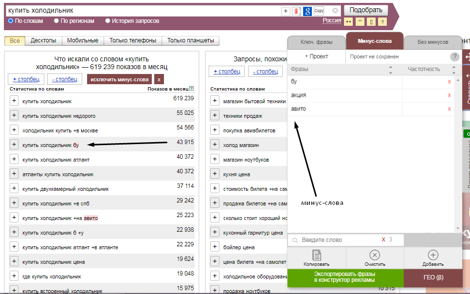 • Минус-фразы — указать готовый список минус-слов + минус-слова по городам.
