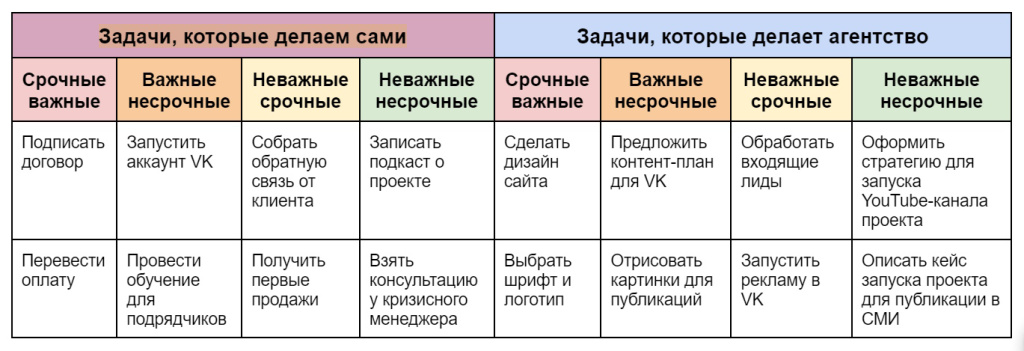 Можно также составить матрицу Эйзенхауэра. В этом методе задачи распределяют по четырем секторам. Срочные и важные ― то, что нужно сделать сейчас. Важные, но не срочные, которые необходимо пока только спланировать. Неважные, но срочные ― те, что можно делегировать. Неважные и несрочные ― их допустимо отложить.