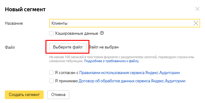 Появится окно, куда нужно загрузить файл с контактными данными ваших клиентов из CRM. Чтобы файл был принят и корректно обработан, ознакомьтесь с требованиями к файлу на сайте Яндекса.